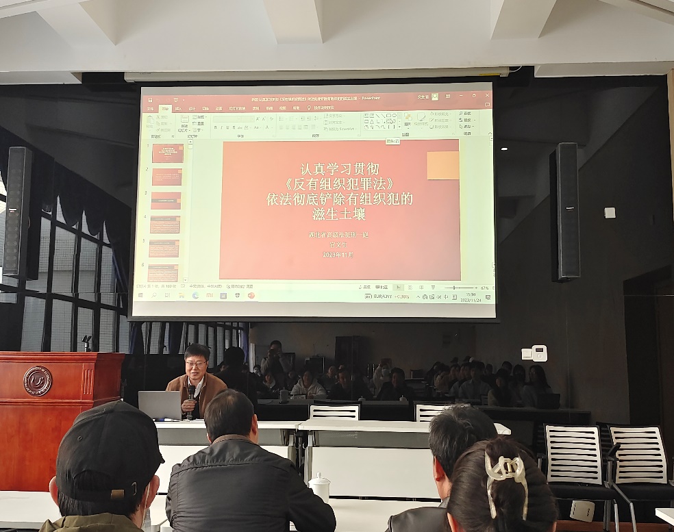 本网讯(通讯员:范琳琳)为落实法律硕士人才培养目标要求,提高法律专业研究生的法治素养,公司推行“腾龙司法名家讲坛”系列活动。11月24日下午,第一讲“伟德BV1946官网离法院有多远——认真学习贯彻《反有组织犯罪法》”正式开讲。此次讲坛邀请湖北省高级人民法院刑事审判第一庭庭长官文生主讲,公司邱秋经理主持,伟德BV1946官网部分教师,辅导员司马子鸣和2023级全体硕士研究生参加。